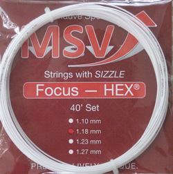 Construction: New Generation CoPolyester string extruded in a Hexagonal form. Has great access to spin and more feel then other polyester based strings. Well suited to power baseline players looking to add some control to their game from a durable string Advantage: This co-poly features solid tension maintenance and long lasting performance. While Luxilon ALU loses 17% tension overnight, the MSV Focus Hex lost a total of just 13% after 30 days and several hours of heavy play. While impressive, the most exciting advantage of this string is simply, "SPIN POTENTIAL." Playtesters describe this string in all gauges as "The absolute BEST spin string ever developed." Gauges: 18g (1.18mm) / 17g (1.23mm) / 16g (1.27mm) Colors: Black, White and Red Why we carry this string: Because we wanted to carry a co-polyester for our string breakers, that would not break the bank. Our research pointed us to this high quality string from MSV. Price of String: $12 - includes Sales Tax Price of String Professionally Installed: $24 - Includes Sales Tax Testimonials: First impressions are very good, nice bite and good touch for a poly, I strung it up as a hybrid with Gosen OG Sheep 16g as the cross in my K6.1 95. I have a tough match tomorrow and we'll see how it performs then. From: Christo, I switched from Big Banger to MSV Hex last year. I'm a 4.5 and 50 years old. I play 8 hours per week. These strings are fantastic. Crisp feel, great control, and the most spin of any string I have ever used. I'm usually tempted to cut them out before they break. I upped my tension from 58 to 61, it feels crisper and no loss of power. Four other guys on my 4.5 team have switched to this string. From: David |